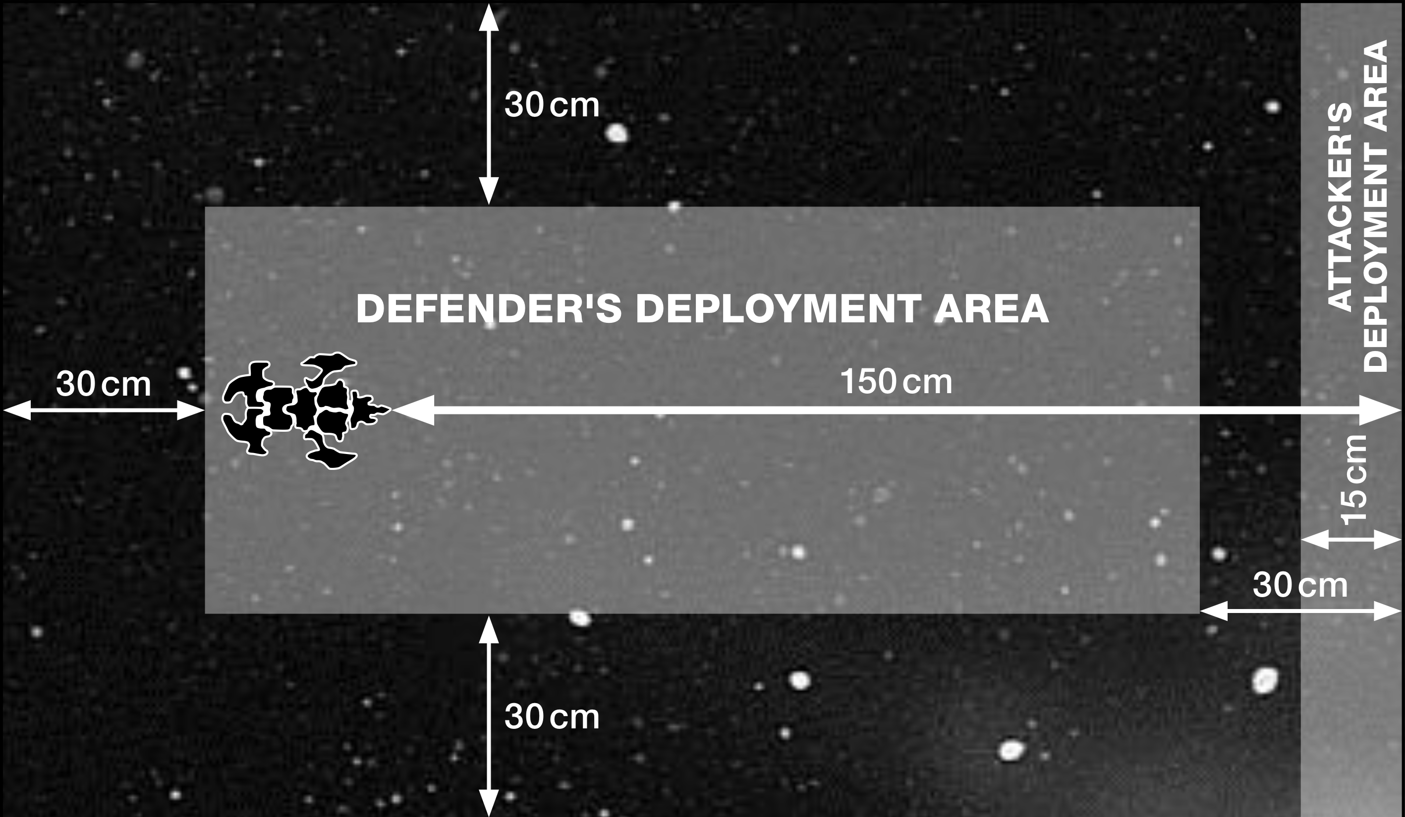 Ships on patrol may be set up anywhere that is not within 30cm of a table edge or within an area of celestial phenomena. The defender always decides the facing of ships, regardless of who set them up. The attacker deploys his fleet within 15cm of the short table edge furthest from the planet. You will also need a separate low orbit table.