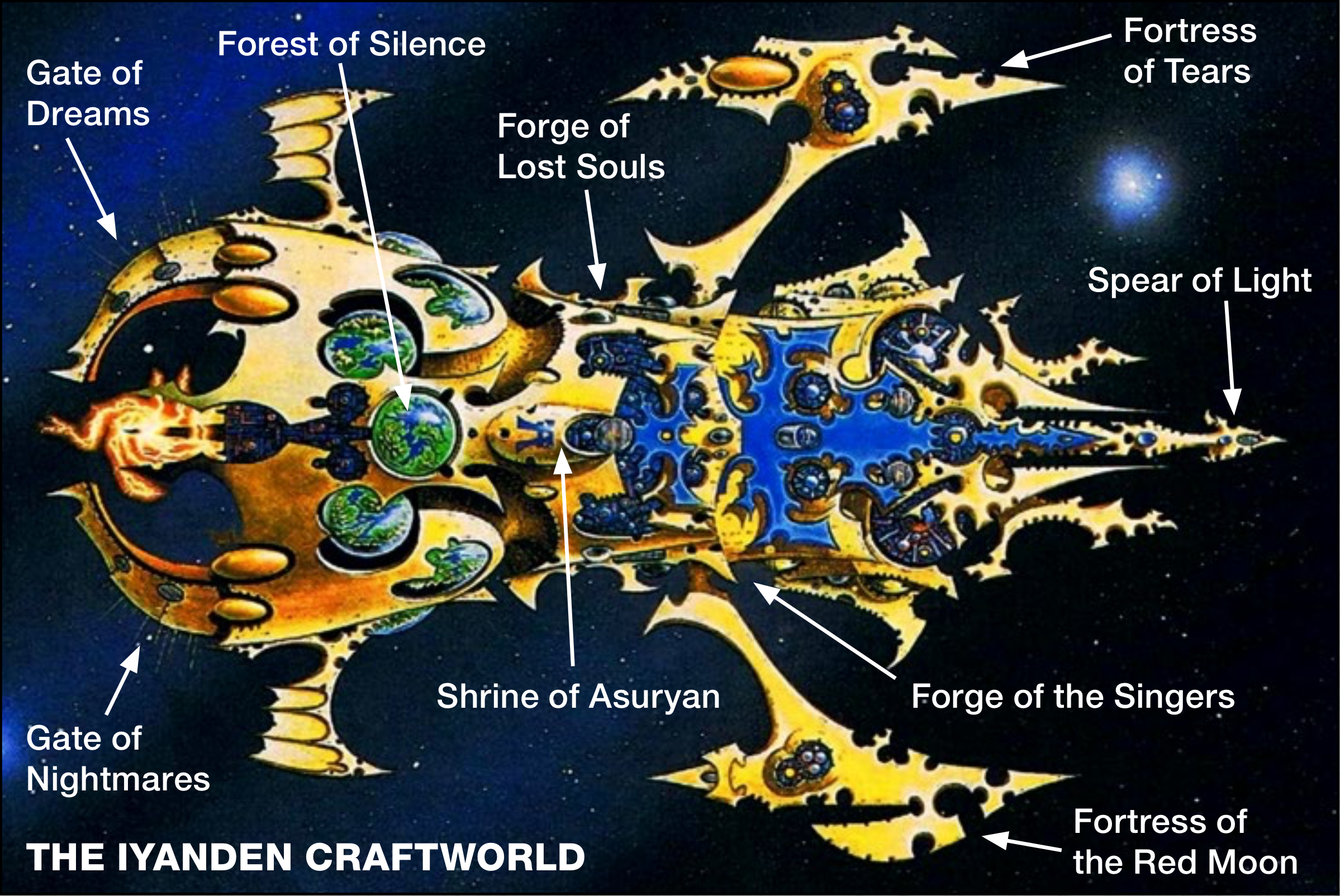 Small craftworlds have a gravity well of 10cm, medium craftworlds of 15cm and large craftworlds of 20cm. The craftworld is placed no more than 150cm from one of the short table edges. Whilst craftworlds do actually travel through space, their progress is so remarkably slow that during the course of a battle they will exhibit no noticeable movement, and hence the template representing the Craftworld itself does not move, in just the same way as planets do not move during a battle, despite their actual movement in orbit of the nearest star. Instead of planetary defenses in the normal sense, individual areas of the Craftworld are purpose-constructed to provide for its collective defense. In the particular case of Iyanden, these roles are fulfilled by three areas – the Spear of Light, the Fortress of Tears, and the Fortress of the Red Moon. Whilst other craftworlds may vary in their defenses, you can safely use the following rules as standard for all craftworlds.