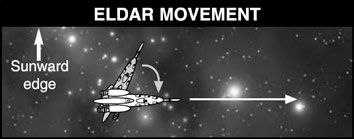 An easy way to determine a ships facing in relation to the sunward edge is to place a bearing compass over the ship and draw the shortest possible line from the ships stem to the sunward edge. The arc this line passes through is the sunward facing, or sunward arc. Eldar ships have no minimum move distances. They move from zero up to the maximum distance allowed by the direction of the sun. After their initial turn they travel in a straight line and may not make additional turns as they move. If under Lock-On special orders, Eldar ships cannot turn for BOTH their movement phases.