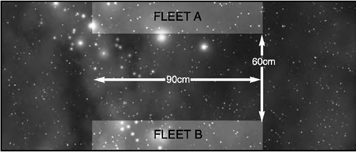 One player rolls a dice. On a 1, 2 or 3 they set up in the area marked Fleet A on the map. On a 4, 5 or 6 their ships must be set up in the Fleet B zone.
