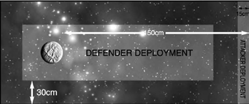 The attacker sets up his entire fleet within 15 cm of the table edge which is furthest from the planet.