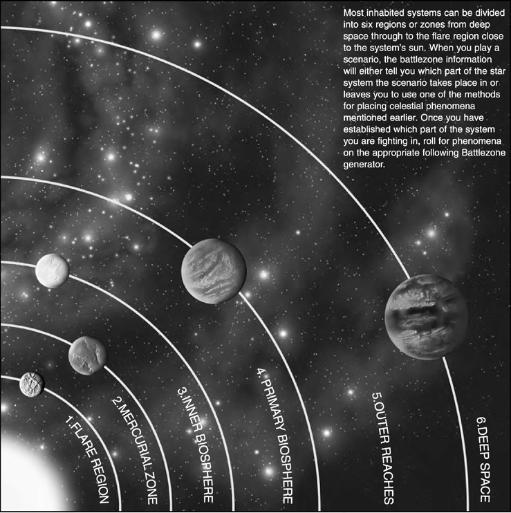 Divide the table into 60 cm square areas. Next roll a D6 for each area. On a 4 or more the area contains celestial phenomena which is determined using the appropriate battlezone generator. Roll a D6 to determine which of the generators to use for this battlefield (or agree on one with your opponent) and then roll on that generator for celestial phenomena in each area. Position the phenomena anywhere within the area, but don’t place them on top of each other. We’ve included a set of sample battlezone generators over the following pages, but it’s easy enough to come up with your own customised ones that include all the celestial phenomena in your own collection.