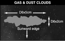 Use flock or cotton wool to show gas & dust clouds, usually found in bands or streamers running parallel to the sunward table edge. Each band is D6×2 cm wide and D6×5 cm long.