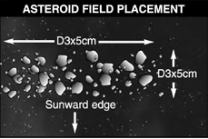 Asteroid fields can be represented by an area of rocks, pebbles, gravel or kitty litter (unused!). Like gas and dust clouds, asteroid fields are placed so that they run parallel to the sunward table edge. Typically, asteroid fields are D3×5 cm wide and D3×5 cm long.