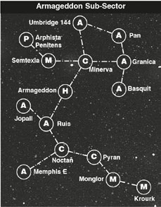 The Third Armageddon War¶ Armageddon Sector¶ Key to Sub-Sector Maps¶ AAgri-world CCivilised world FForge world HHive world MMining world PPenal world UUninhabited system Scenarios¶ Scenario One: The Gauntlet Scenario Two: Parol’s Bait Scenario Three: Pelucidar