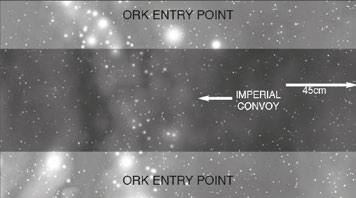 The Imperial convoy and escorting ships are all placed within 30 cm of the centre of the table at the start of the game, facing either short table edge. The Ork ships move on from any point along either long table edge in the first turn as normal.